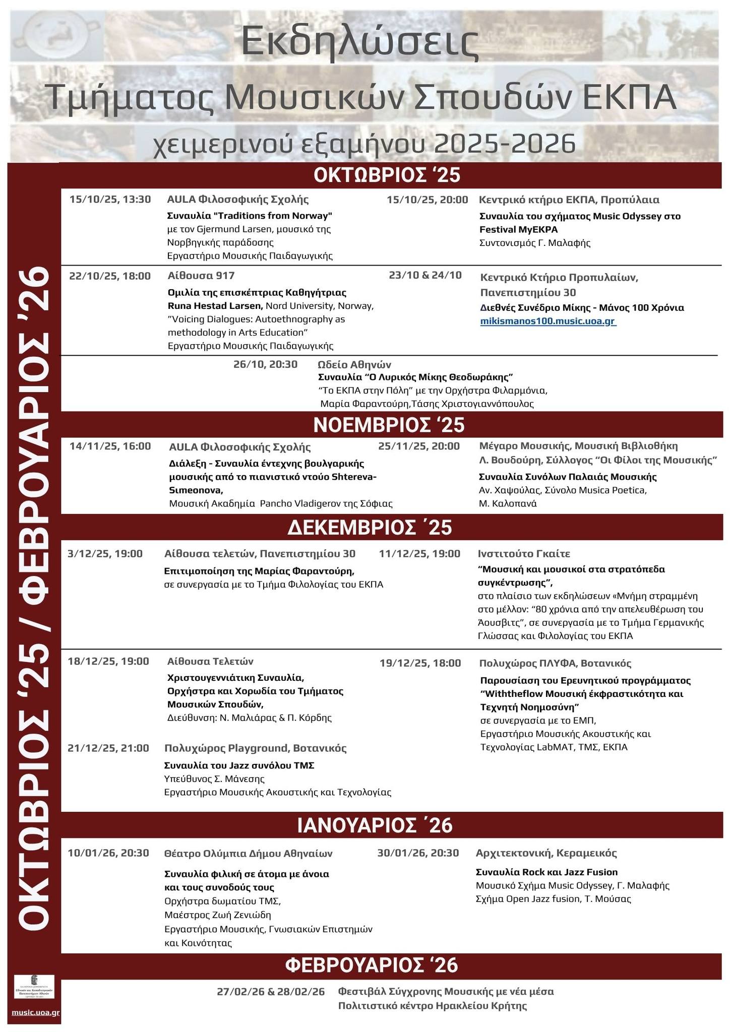 ΕΚΔΗΛΩΣΕΙΣ ΤΜΗΜΑΤΟΣ ΜΟΥΣΙΚΩΝ ΣΠΟΥΔΩΝ – ΧΕΙΜΕΡΙΝΟ ΕΞΑΜΗΝΟ 2025-2026